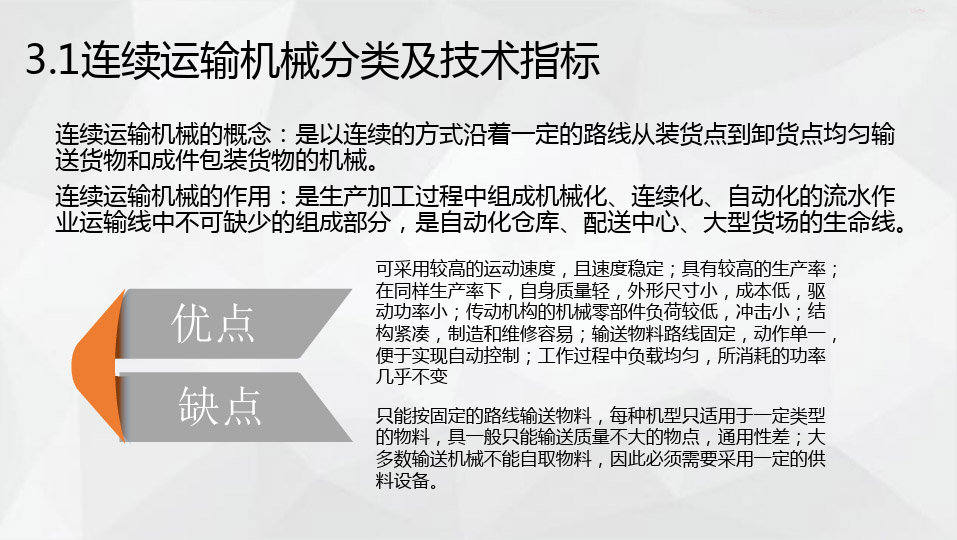 連續(xù)運(yùn)輸機(jī)械的概念:是以連續(xù)的方式沿著一定的路線從裝貨點(diǎn)到卸貨點(diǎn)均勻輸送貨物和成件包裝貨物的機(jī)械。 連續(xù)運(yùn)輸機(jī)械的作用:是生產(chǎn)加工過(guò)程中組成機(jī)械化、連續(xù)化、自動(dòng)化的流水作業(yè)運(yùn)輸線中不可缺少的組成部分,是自動(dòng)化倉(cāng)庫(kù)、配送中 心、大型貨場(chǎng)的生命線。