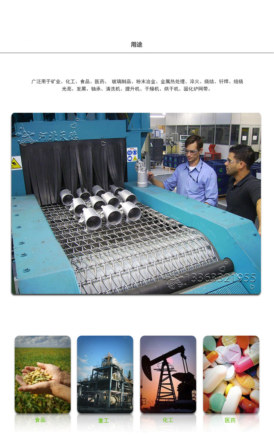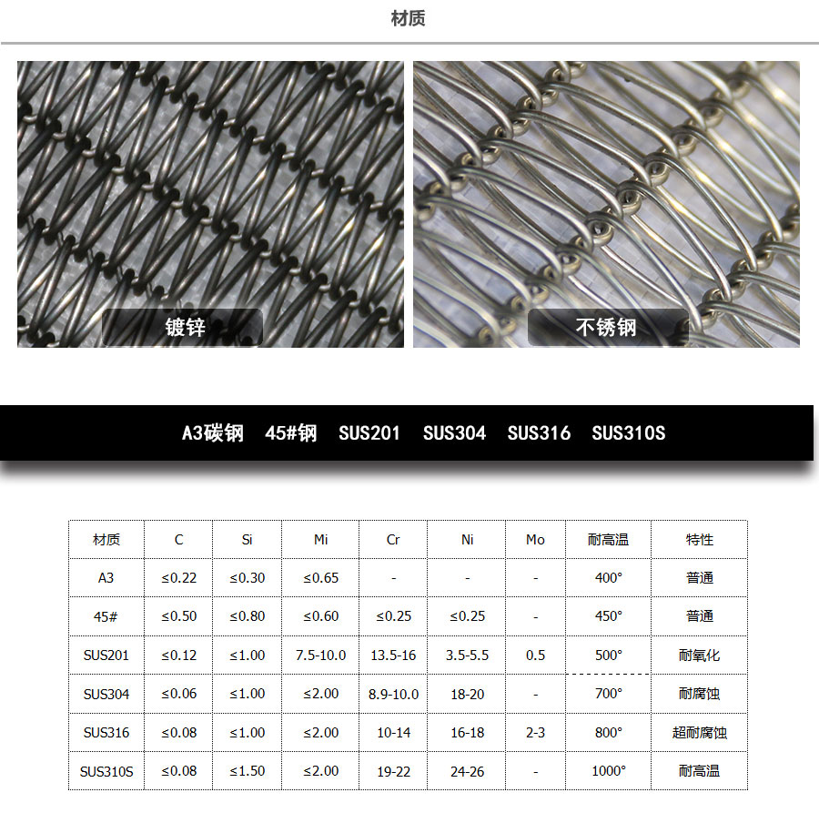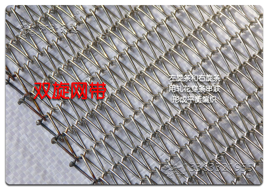 雙旋輸送帶:由左右交替的網(wǎng)條通過(guò)軋花串條聯(lián)結(jié)而成,集中了金屬絲編織網(wǎng)帶的各種優(yōu)點(diǎn),由于具有彎曲較深的串條,使各個(gè)螺旋盤條的位置取得正確的定位,因此可以減少網(wǎng)帶的變型和延伸。 雙旋輸送帶材質(zhì):不銹鋼201、不銹鋼304、不銹鋼316、不銹鋼316L、普通鋼絲、普通鐵絲、耐高溫不銹鋼、耐酸不銹鋼 雙旋輸送帶用途:廣泛用于石油、冶金、食品加工機(jī)械、制藥、玻璃、印制線路板等輸送設(shè)備。