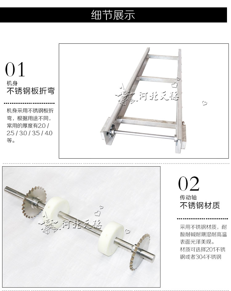 網帶輸送機結構形式: 水平直線輸送、提升爬坡輸送、轉彎輸送等多種形式,輸送帶上還可增設提升擋板、側擋板等附件,能滿足各種工藝要求。輸送機材質:有A3低碳鋼、201不銹鋼、304不銹鋼等。