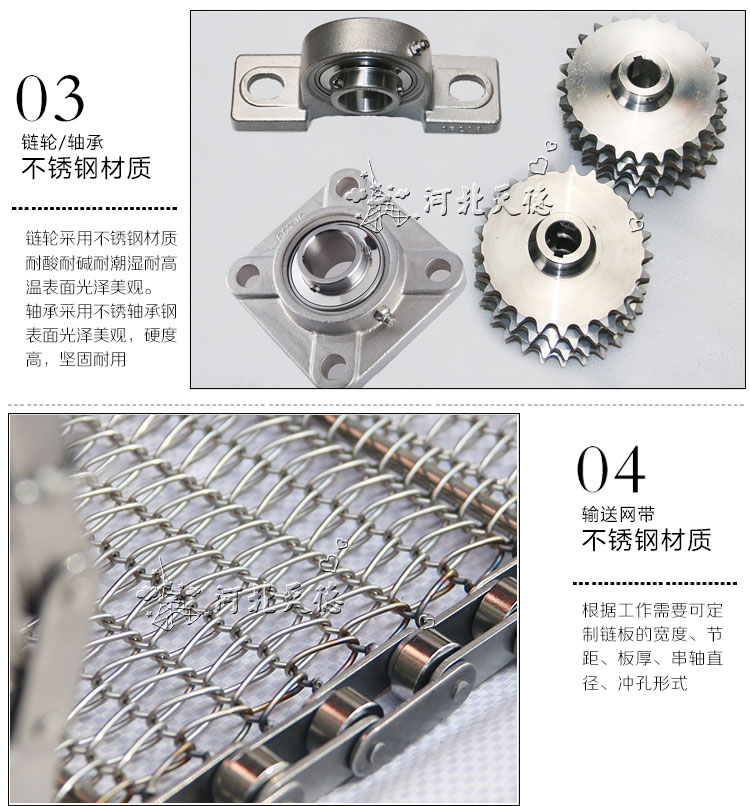 該輸送機用于物料的輸送。采用不銹鋼網帶作為載體,適用于各種食品行業的烘干、去濕、冷凍等、熱處理等;不銹鋼制成,具有耐高溫、便于清洗等特點。輸送機應用行業:食品、冶金、電力、煤炭、化工、建材、碼頭、糧食等。