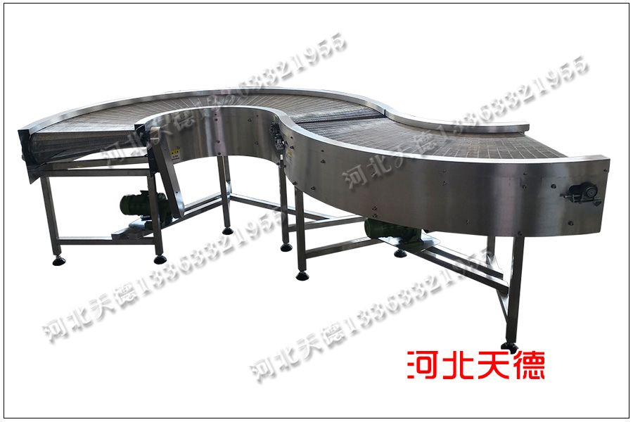 遼寧錦州客戶定制的轉(zhuǎn)彎網(wǎng)帶輸送機(jī),該輸送機(jī)是連續(xù)轉(zhuǎn)彎輸送機(jī),用兩臺轉(zhuǎn)彎角度不同的輸送機(jī)拼接而成的。這兩條轉(zhuǎn)彎輸送機(jī)都采用鏈條輸送帶來傳送物品,都是采用不銹鋼材質(zhì)定制加工的,輸送機(jī)的寬度為500毫米,高度為60公分,轉(zhuǎn)彎角度根據(jù)客戶提供來加工的,整機(jī)焊點較少,外形漂亮。